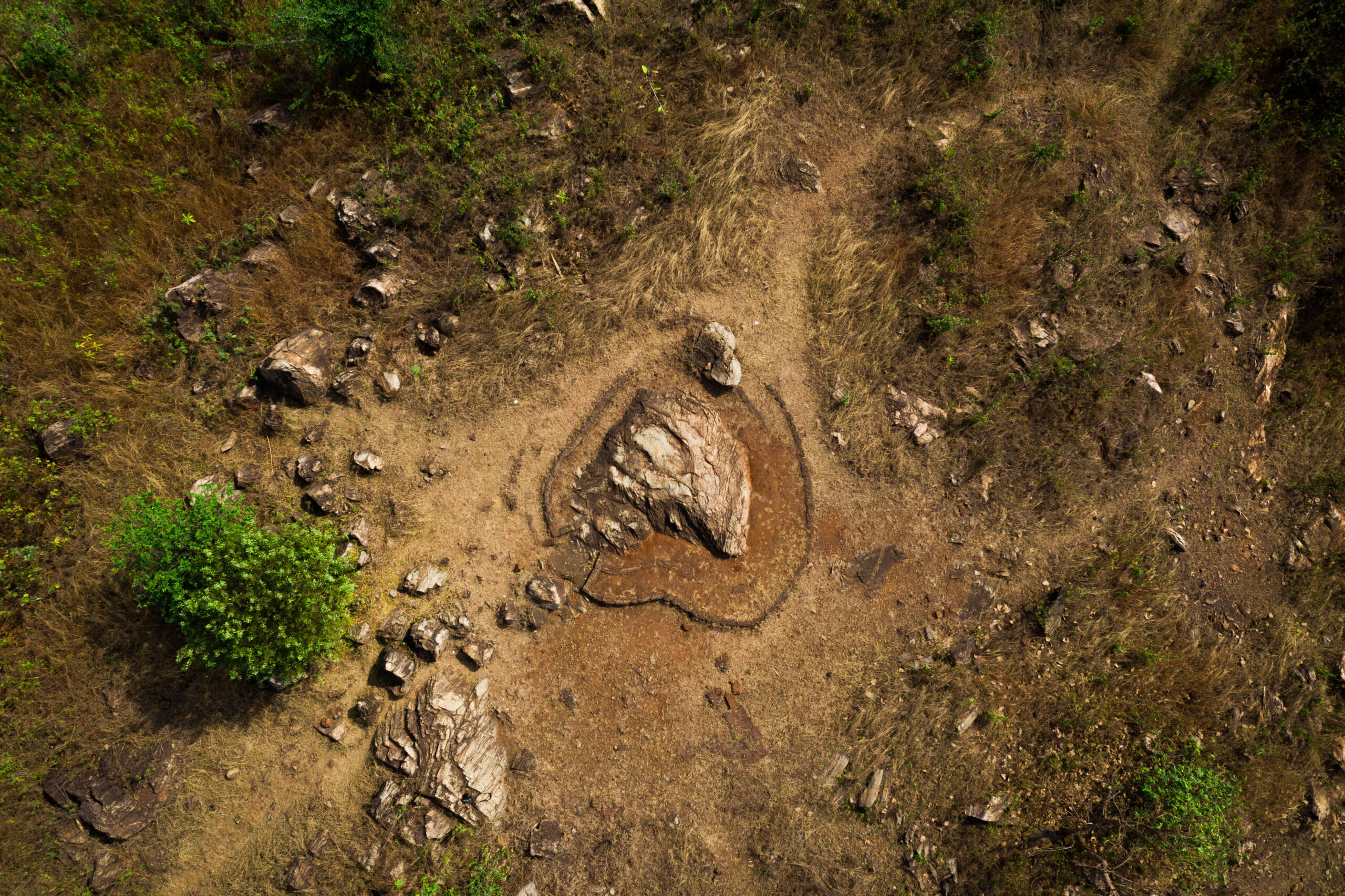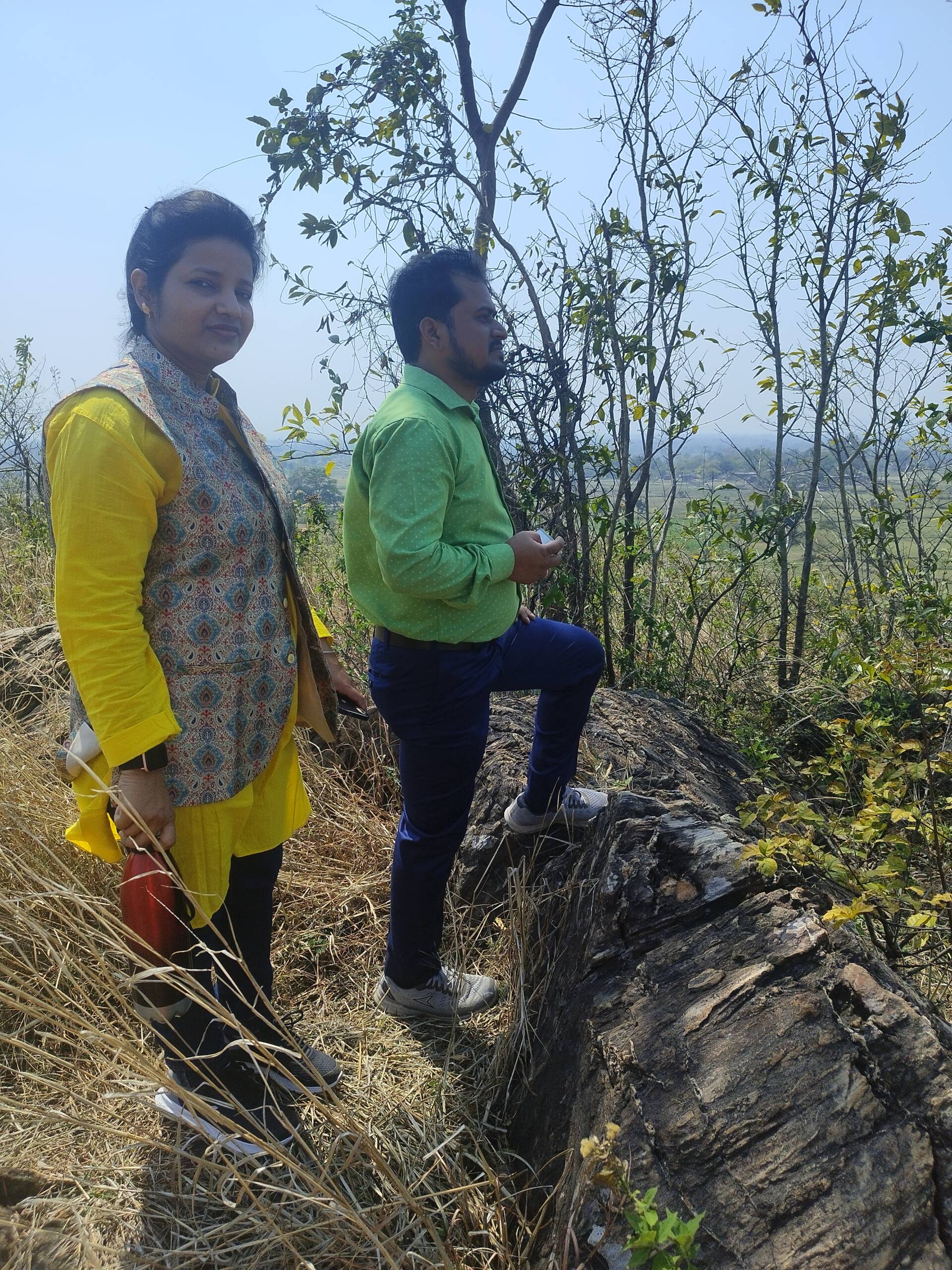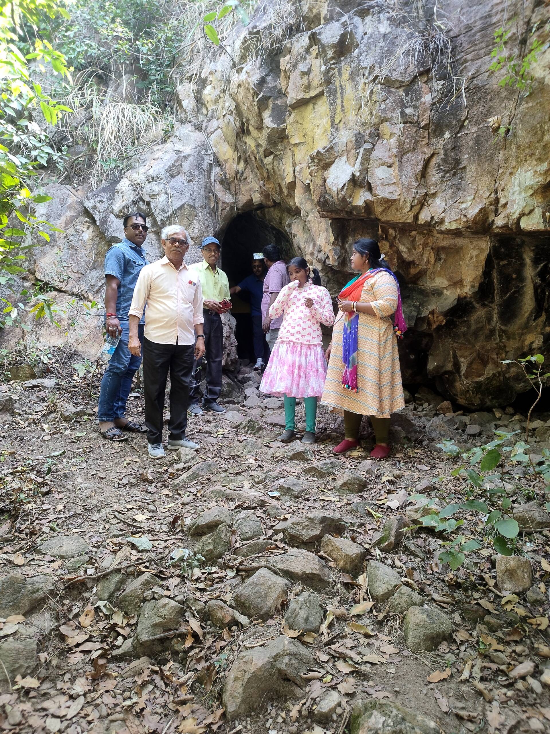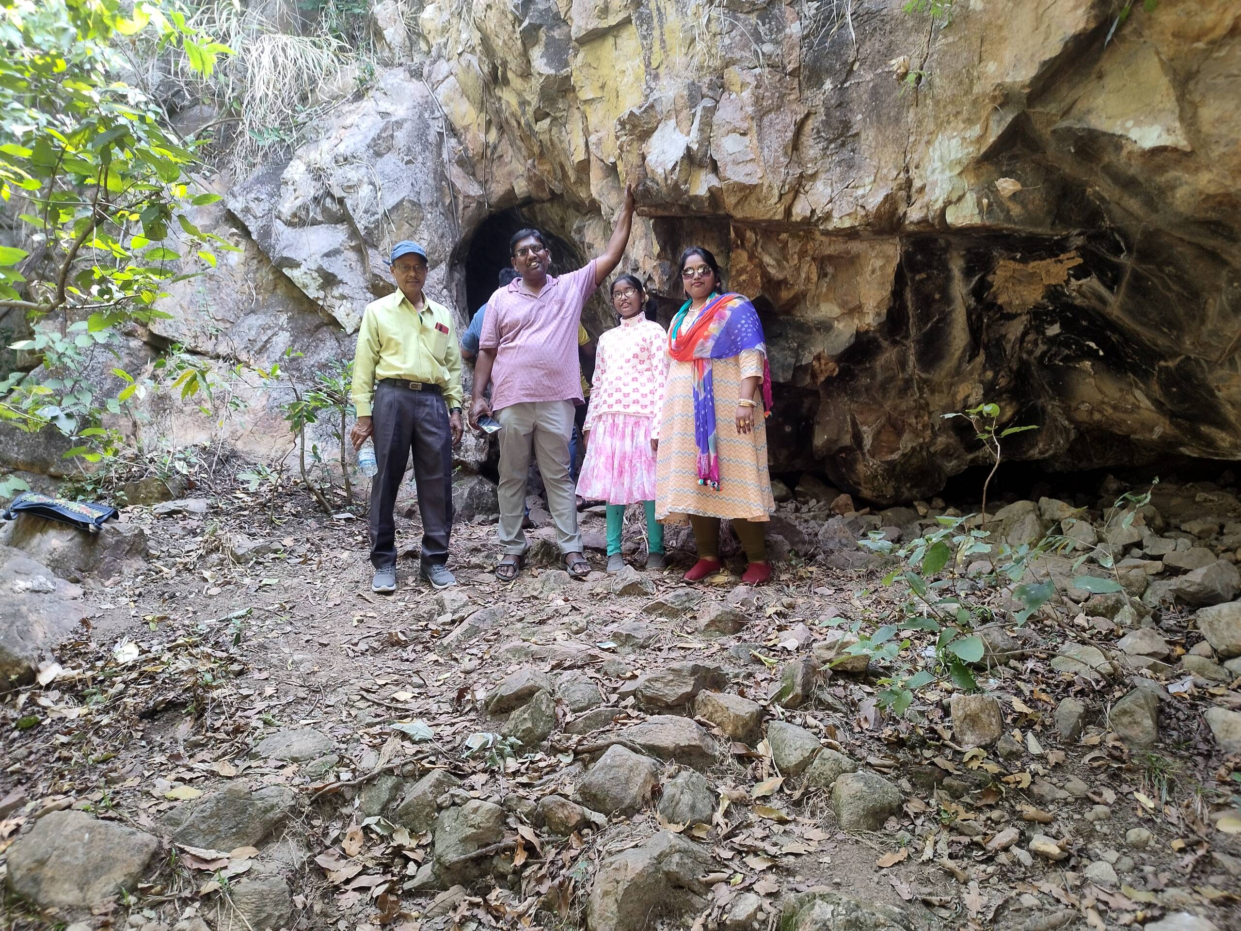 We found a cave near the bottom of the Dimbagiri alias Dimdihá. Probably, seekers of the Supreme used to perform tantrik practice here about five thousand and a half years ago. Many tantrik symbols are etched on the sides of the cave. It is obvious from the structure of the cave that it dates back to the Bronze Age or the Iron Age. We know that caves are either natural or man- made. This cave is man-made. This is obvious from a look at its walls. It has a depth of about fifty feet. One has to crawl on one’s chest to enter it. But inside the cave, there is space for sitting down. It has two storeys. Eight to ten persons can sit together inside it.